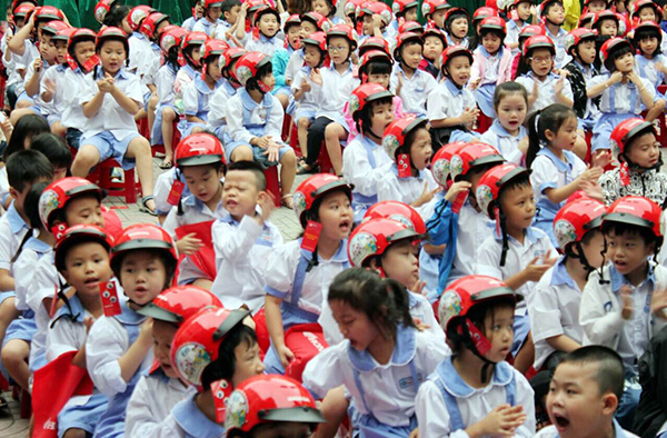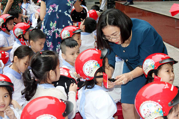 Hơn 500 bé lớp 1 Trường tiểu học Đinh Tiên Hoàng được nhận những chiếc mũ bảo hiểm mới ngay dịp đầu năm học