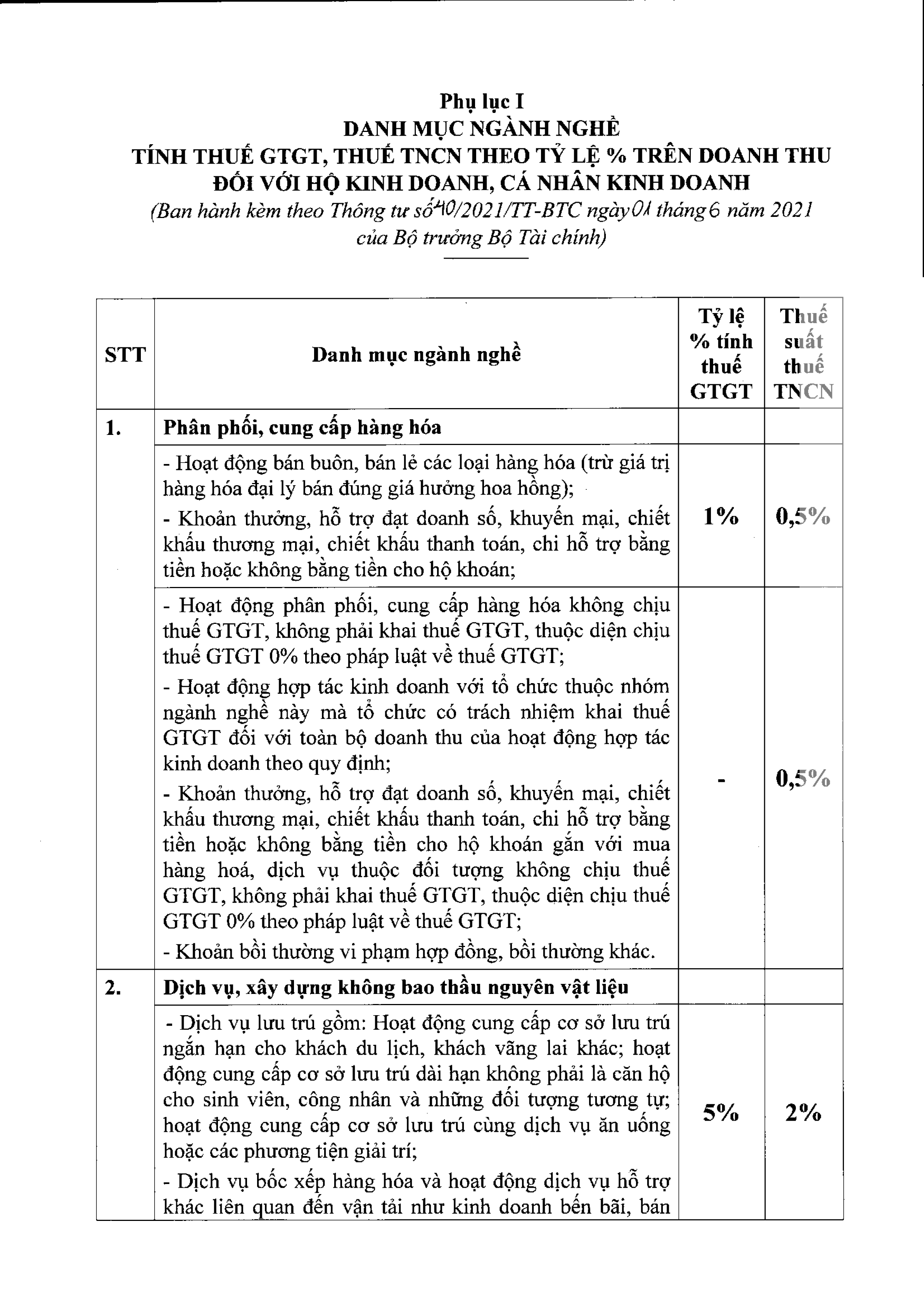 Phụ lục ban hành kèm Thông tư số 40/2021/TT-BTC, thống kê chi tiết thuế suất thuế TNCN, GTGT cho từng đối tượng hộ, cá nhân kinh doanh, do Bộ Tài chính ban hành.