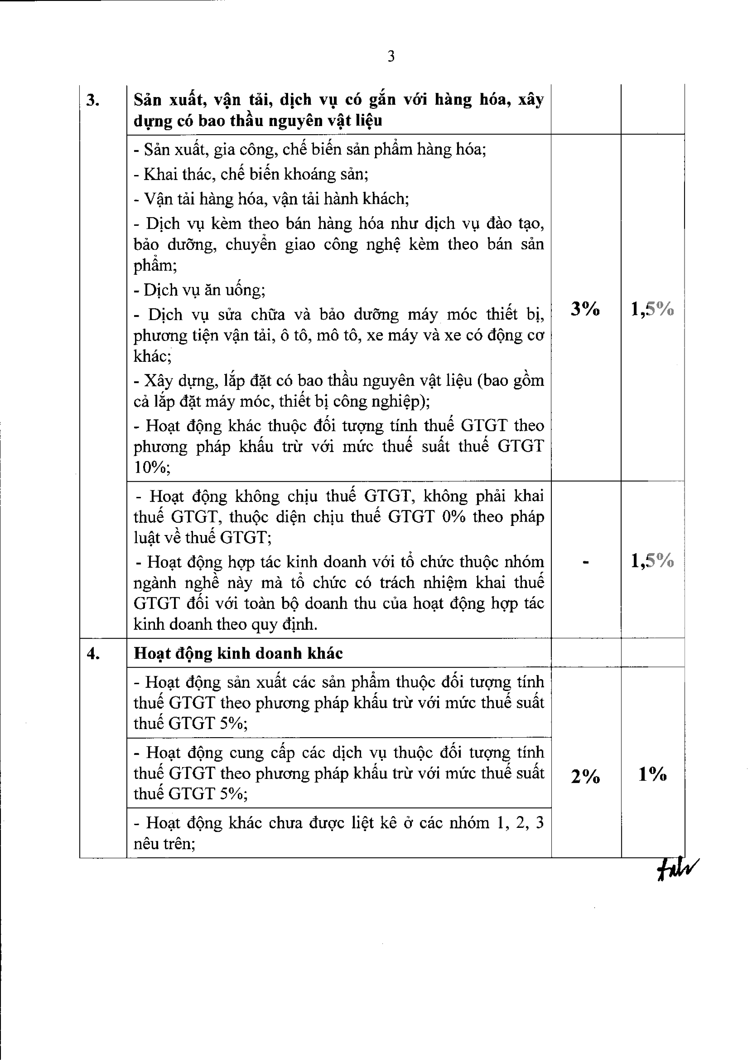 Một số ngành nghề khác như dịch vụ vận tải hàng hóa, vận tải hành khách; dịch vụ ăn uống; dịch vụ sửa chữa và bảo dưỡng máy móc thiết bị, phương tiện vận tải, ô tô, mô tô, xe máy… sẽ có mức thuế GTGT 3% và thuế TNCN 1,5%…