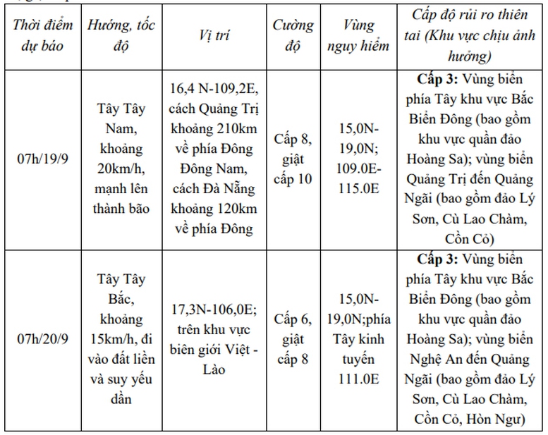 Trung tâm Dự báo khí tượng thủy văn quốc gia cho biết, hồi 7 giờ ngày 18/9, vị trí tâm áp thấp nhiệt đới ở vào khoảng 16,7 độ Vĩ Bắc; 113,5 độ Kinh Đông, cách quần đảo Hoàng Sa khoảng 220 km về phía đông. Sức gió mạnh nhất vùng gần tâm áp thấp nhiệt đới mạnh cấp 7 (50-61 km/h), giật cấp 9; di chuyển chủ yếu theo hướng Tây với tốc độ khoảng 15 km/h.