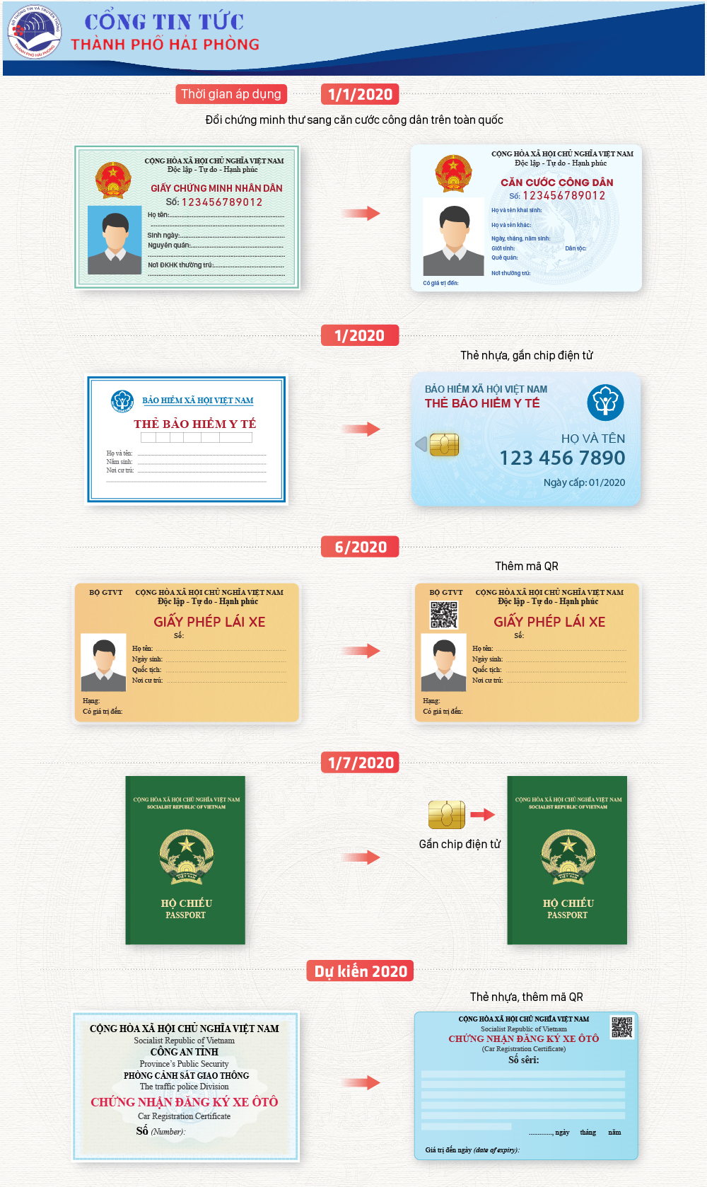 Theo quy định, từ ngày 01/01/2020, bằng lái xe, hộ chiếu, thẻ bảo hiểm xã hội và đăng ký xe là 5 loại giấy tờ tùy thân sẽ thay đổi. Tất cả đều được mã hóa, gắn chip điện tử.