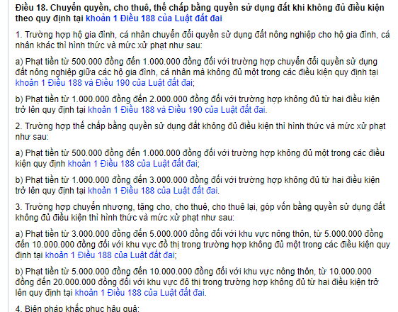 Trường hợp chuyển nhượng, tặng cho, cho thuê, cho thuê lại đất không đủ điều kiện nêu trên thì theo khoản 3 Điều 18 Nghị định 91/2019/NĐ-CP, người thực hiện hành vi sẽ bị phạt tiền từ 3-5 triệu đồng với khu vực nông thôn, từ 5-10 triệu đồng với khu vực đô thị nếu không đủ một trong các điều kiện. Phạt tiền từ 5-10 triệu đồng với khu vực nông thôn, từ 10-20 triệu đồng với khu vực đô thị nếu không đủ từ 2 điều kiện trở lên.
