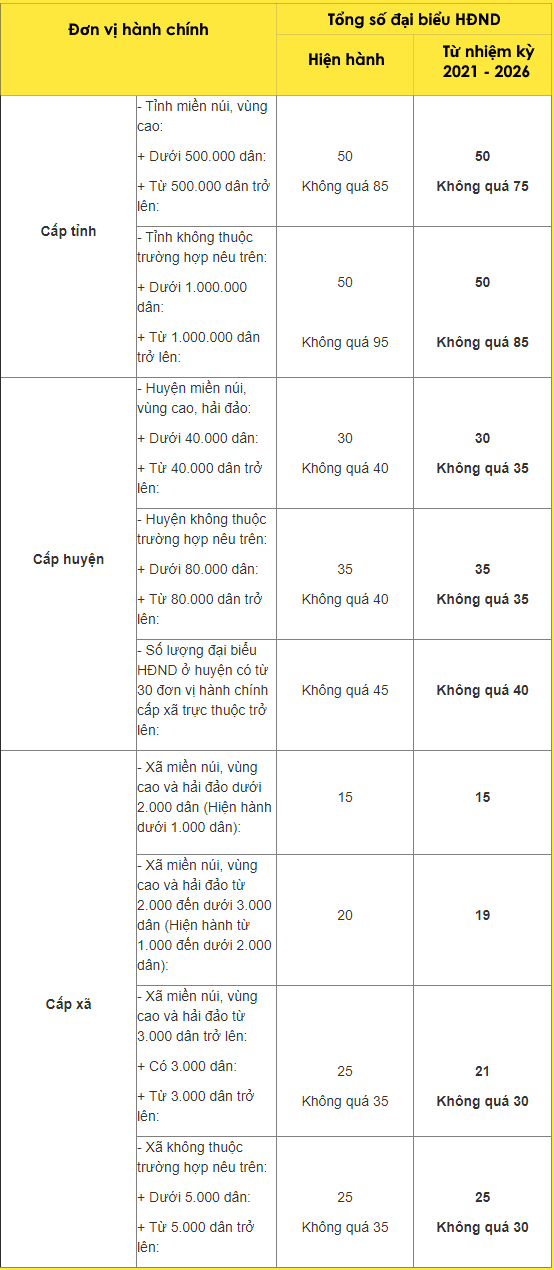 Theo đó, số lượng đại biểu HĐND cấp tỉnh, huyện, xã chính thức giảm từ nhiệm kỳ 2021 – 2026 như sau: