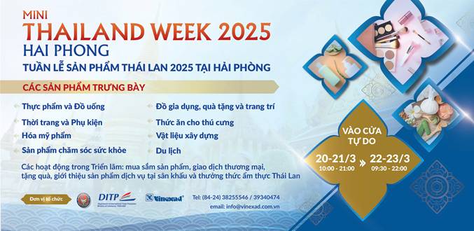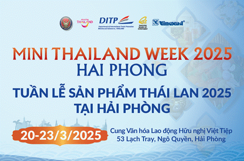 Cục Xúc tiến Thương mại Quốc tế (DITP), Bộ Thương mại Thái Lan, Văn phòng Thương mại – Đại sứ quán Vương quốc Thái Lan tại Hà Nội phối hợp với Công ty Cổ phần Quảng cáo và Hội chợ Thương mại VINEXAD tổ chức “Tuần lễ sản phẩm Thái Lan 2025” tại Hải Phòng. Sự kiện sẽ diễn ra từ ngày 20-23/03/2025, tại Cung Văn hóa Lao động Hữu nghị Việt Tiệp, số 53 đường Lạch Tray, quận Ngô Quyền.