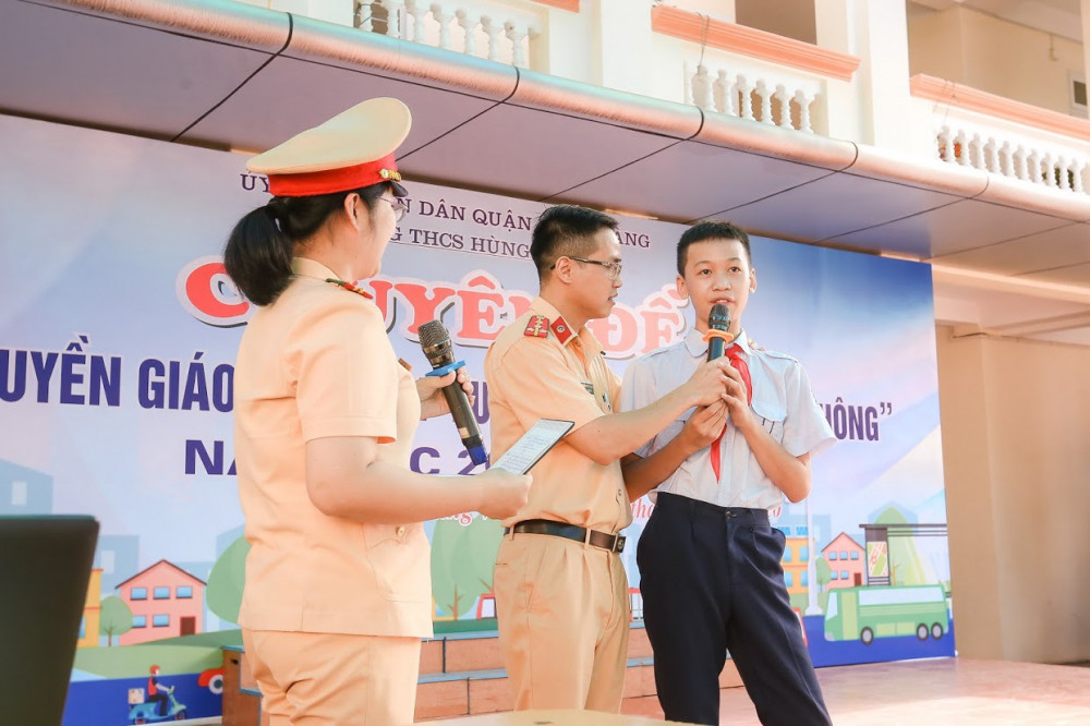 Tham gia buổi tuyên truyền, hơn 800 học sinh, giáo viên Trường Tiểu học Hùng Vương được các chiến sỹ thuộc Đội CSGT-TT Công an quận Hồng Bàng và Đội tuyên truyền Phòng PC08-CATP truyền tải các kiến thức về an toàn giao thông bằng phương pháp trực quan sinh động, lấy học sinh làm trung tâm. Qua phần giao lưu, trò chuyện, đặc biệt là các câu đố vui về chủ đề giao thông, các chiến sỹ CSGT đã lồng ghép nội dung tuyên truyền luật giao thông cho các em, tập trung vào những nguyên tắc đảm bảo an toàn khi đi bộ, đi xe đạp, xe mô tô; hướng dẫn các em đội mũ bảo hiểm đúng cách; nhắc nhở các em khi được bố mẹ đưa đi học bằng xe ô tô phải chú ý thắt dây an toàn…