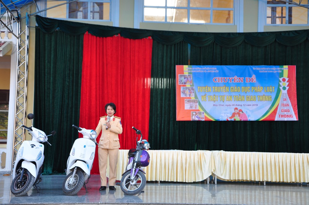 Tại buổi tuyên truyền, cán bộ Phòng CSGT đường bộ – đường sắt đã trao đổi về tình hình TTATGT có liên quan đến các em học sinh, sinh viên, đưa ra một số vụ tai nạn giao thông thương tâm và những vi phạm chủ yếu của học sinh khi tham gia giao thông, tập trung vào đối tượng là các em học sinh đang sử dụng phương tiện xe đạp điện, xe máy điện và xe gắn máy có dung tích xi – lanh dưới 50cm3. Đồng thời hướng dẫn cách nhận biết các loại phương tiện, độ tuổi được phép điều khiển phương tiện, phân biệt mũ bảo hiểm và mũ thời trang…