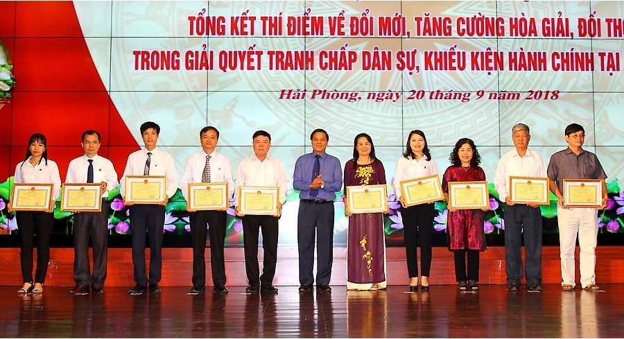 Nhân dịp này, TAND tối cao tặng bằng khen 6 tập thể, 14 cá nhân; UBND thành phố Hải Phòng tặng bằng khen 5 tập thể, 5 cá nhân; TAND thành phố Hải Phòng tặng giấy khen 21 cá nhân có thành tích xuất sắc trong triển khai thí điểm về đổi mới, tăng cường hòa giải, đối thoại trong giải quyết tranh chấp dân sự, khiếu kiện hành chính tại Hải Phòng.