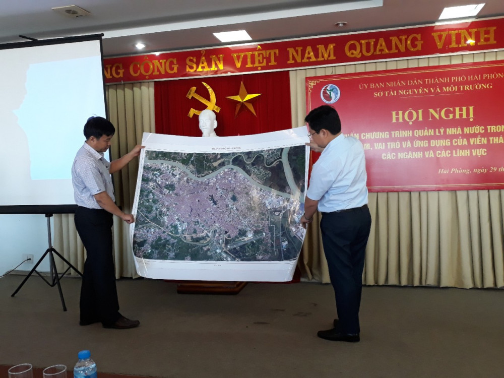 Lãnh đạo Sở Tài nguyên-Môi trường tiếp nhận bản đồ vệ tinh thành phố Hải Phòng do Cục Viễn thám quốc gia trao tặng