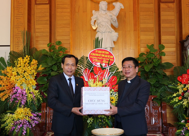 Trước đó, ngày 19-12, nhân dịp lễ Giáng sinh 2018, Phó chủ tịch Ủy ban MTTQ Việt Nam thành phố Đỗ Tràng Thành cùng đoàn công tác đến thăm, tặng quà, động viên chức sắc tiêu biểu trên địa bàn thành phố. Đoàn đến thăm và tặng hoa, quà các chức sắc tiêu biểu: linh mục Nguyễn Văn Ninh, Giáo xứ Lãm Hà và mục sư Nguyễn Kim Cương, Quản nhiệm Hội thánh Tin lành (quận Kiến An); linh mục Nguyễn Văn Phê, Giáo xứ An Toàn, phường Hòa Nghĩa (quận Dương Kinh); linh mục Vũ Văn Kiện-Giám đốc Caritas Giáo phận Hải Phòng, quản nhiệm xứ An Hải và linh mục Bùi Văn Hân, Giáo xứ Nam Pháp, phường Đằng Giang (quận Ngô Quyền); linh mục Nguyễn Văn Chiến, Giáo xứ Đồng Giá, xã Thiên Hương (huyện Thủy Nguyên).