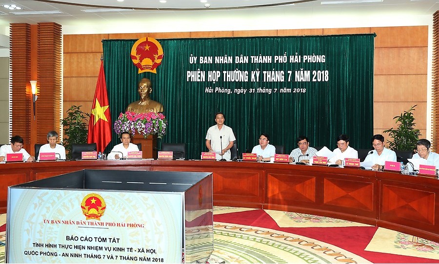 Tại phiên họp, lãnh đạo UBND thành phố và các ngành thống nhất nhận định: tháng 7 và 7 tháng năm 2018, Hải Phòng tiếp tục chuyển biến mạnh mẽ, tốc độ tăng trưởng cao, là điểm sáng của cả nước về phát triển kinh tế- xã hội (KTXH), giữ vững quốc phòng- an ninh. Nhiều chỉ tiêu KTXH chủ yếu duy trì mức tăng trưởng cao, như sản xuất công nghiệp, kim ngạch xuất khẩu, sản lượng hàng qua cảng; thu ngân sách nội địa, thu hút khách du lịch… Các dự án trọng điểm được triển khai đúng kế hoạch, tiến độ như hạ tầng kỹ thuật Khu đô thị mới Bắc sông Cấm; Nhà máy ô tô Vinfast; các dự án du lịch tại huyện Cát Hải… Đồng thời, chuẩn bị tốt các hồ sơ tài liệu phục vụ kỳ họp thứ 7, HĐND thành phố khóa 15; đánh giá nửa nhiệm kỳ thực hiện Nghị quyết (NQ) Đại hội 15 của Đảng bộ thành phố; bảo đảm tiến độ tổng kết 15 năm thực hiện NQ 32 của Bộ Chính trị; tổ chức nhiều hoạt động tri ân nhân kỷ niệm 71 năm Ngày Thương binh- Liệt sĩ (27- 7); chủ động các biện pháp phòng, chống bão số 3, phòng, chống ngập úng và áp thấp nhiệt đới; lĩnh vực giáo dục- đào tạo đạt nhiều thành tích cao…