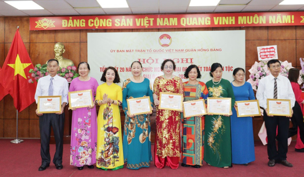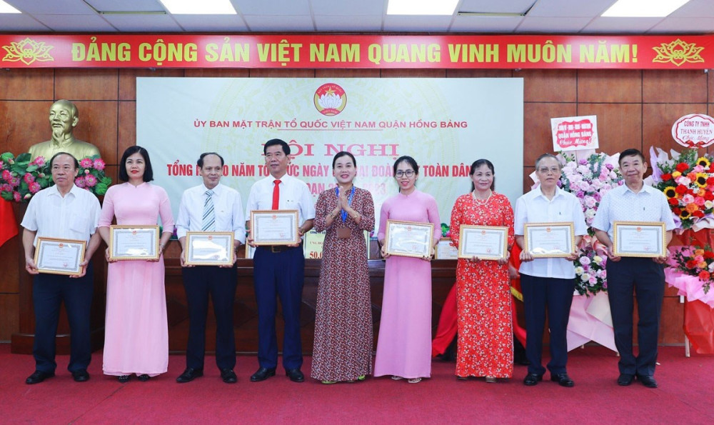 Nhân dịp này, Chủ tịch Ủy ban MTTQ Việt Nam thành phố tặng Bằng khen cho 2 tập thể, 1 cá nhân; Chủ tịch UBND quận Hồng Bàng tặng Giấy khen cho 8 tập thể, 8 cá nhân; Chủ tịch Ủy ban MTTQ Việt Nam quận Hồng Bàng tặng Giấy khen cho 8 tập thể, 8 cá nhân đạt thành tích xuất sắc trong phối hợp, triển khai, tổ chức Ngày hội “Đại đoàn kết toàn dân tộc” giai đoạn 2003-2023.