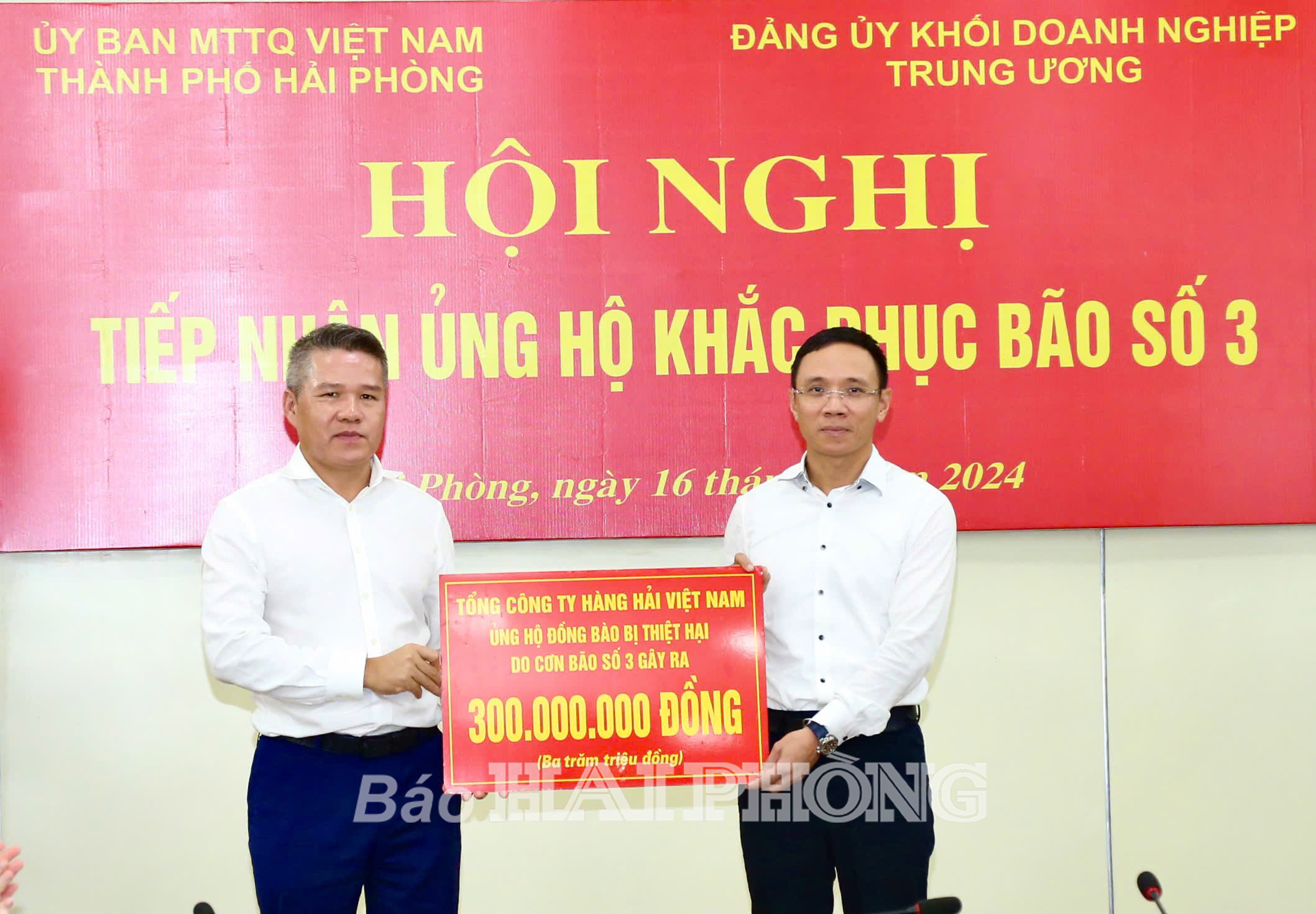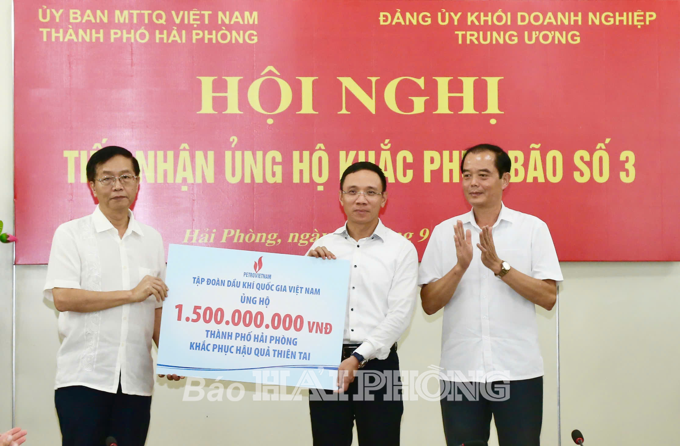 Thay mặt Ban Thường trực Ủy ban MTTQ Việt Nam thành phố, đồng chí Đào Trọng Đức, Chủ tịch Ủy ban MTTQ Việt Nam thành phố trân trọng cảm ơn Đảng ủy Khối Doanh nghiệp Trung ương, các tập đoàn động viên, ủng hộ, hỗ trợ thành phố Hải Phòng khắc phục hậu quả sau bão số 3.