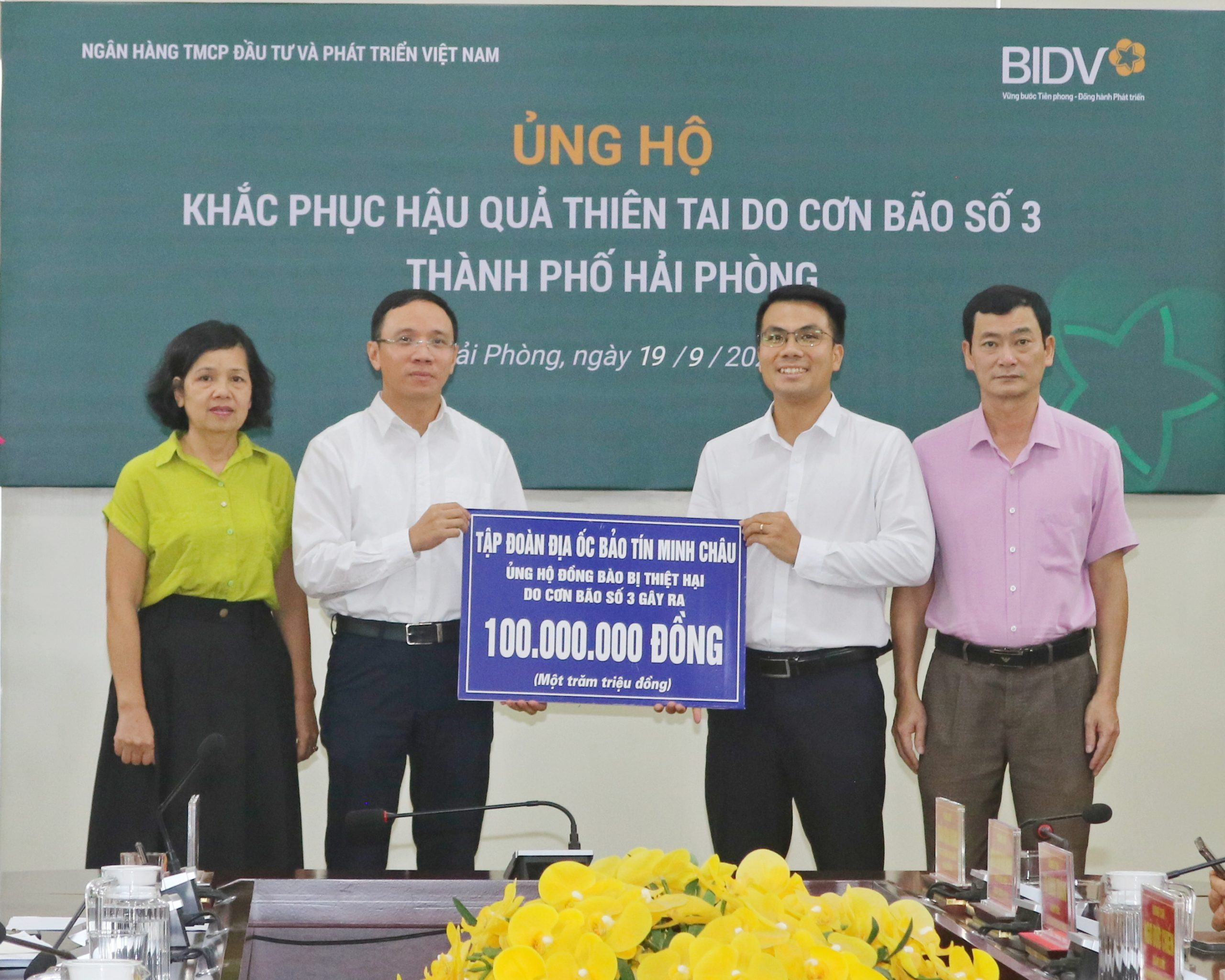 Sáng 19/9, đồng chí Đào Trọng Đức, Ủy viên Ban Thường vụ Thành ủy, Chủ tịch Ủy ban MTTQ Việt Nam thành phố đã tiếp nhận ủng hộ từ Ngân hàng (Thương mại cổ phần) TMCP Đầu tư và Phát triển Việt Nam (BIDV) 1 tỷ đồng và Tập đoàn địa ốc Bảo Tín Minh Châu 100 triệu đồng.