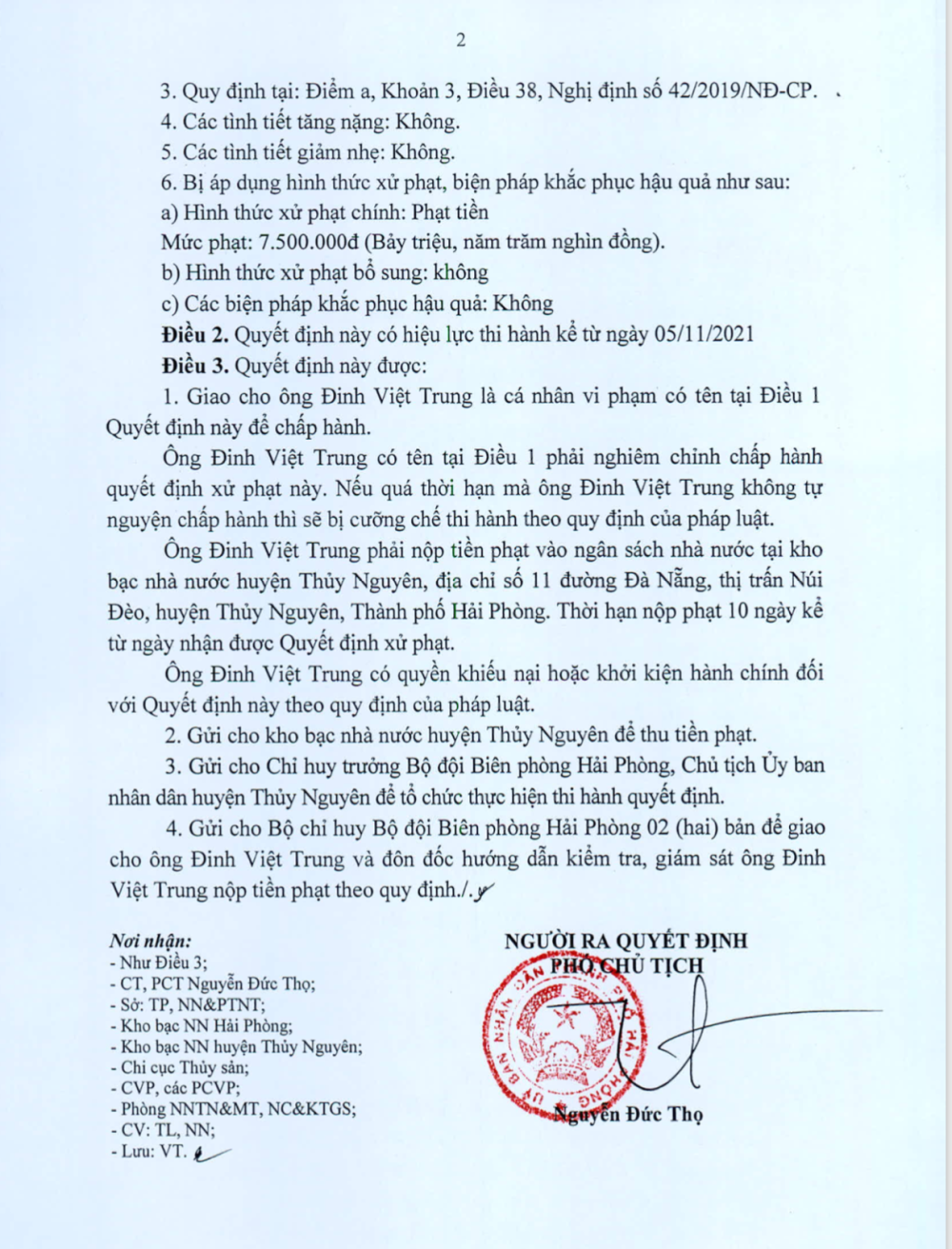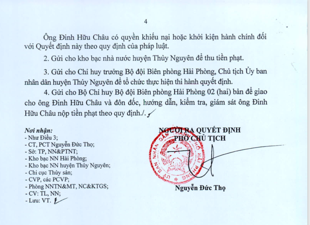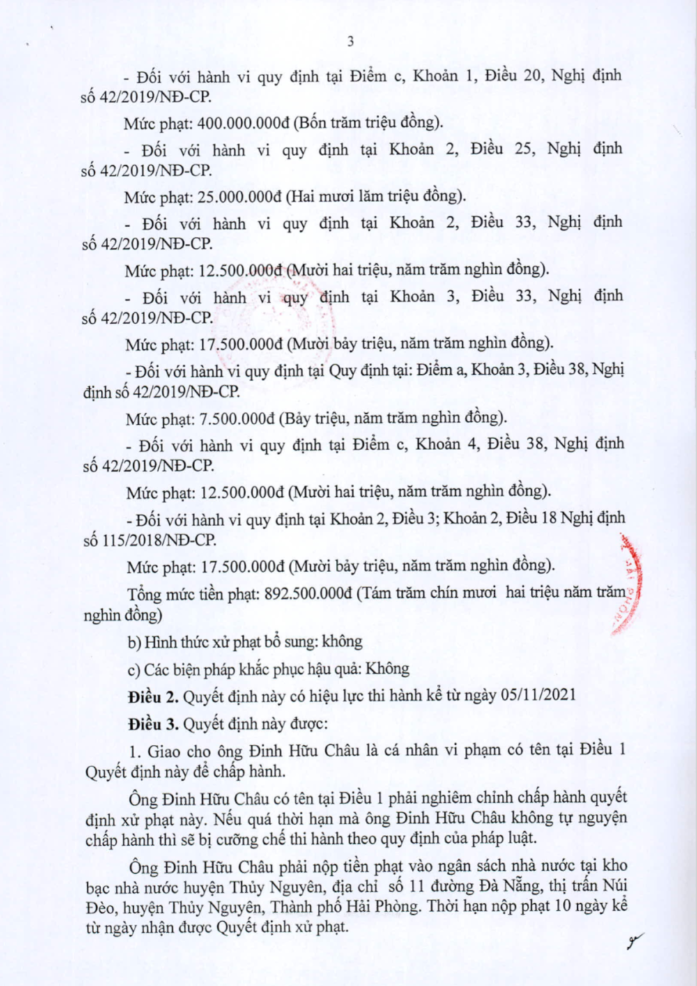 Cả hai Quyết định trên có hiệu lực từ ngày 5/11/2021. Ông Châu và ông Trung phải nộp tiền phạt vào ngân sách nhà nước tại Kho bạc Nhà nước huyện Thủy Nguyên. Thời gian nộp phạt 10 ngày kể từ ngày nhận được Quyết định xử phạt.