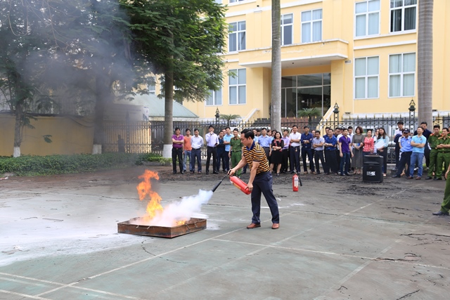 Sau phần lý thuyết, các học viên được thực hành cách sử dụng các phương tiện chữa cháy như bình bột, bình CO2 để dập tắt đám cháy và cách thức xử lý nhanh các tình huống có thể xảy ra.