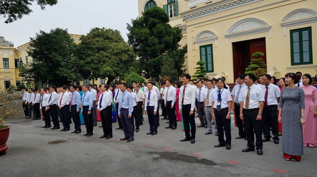 Lãnh đạo UBND thành phố cùng cán bộ, công chức, viên chức, người lao động Văn phòng UBND thành phố thực hiện nghi thức chào cờ sáng nay 10/9