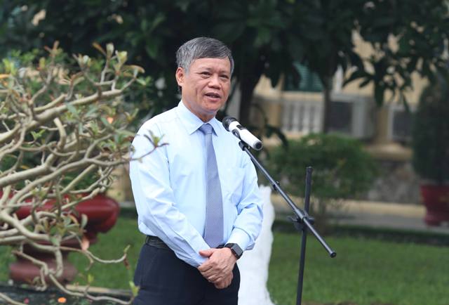 Phó Chủ tịch Thường trực UBND thành phố Nguyễn Xuân Bình biểu dương Văn phòng UBND thành phố đã nghiêm túc tổ chức nghi thức chào cờ hàng tháng