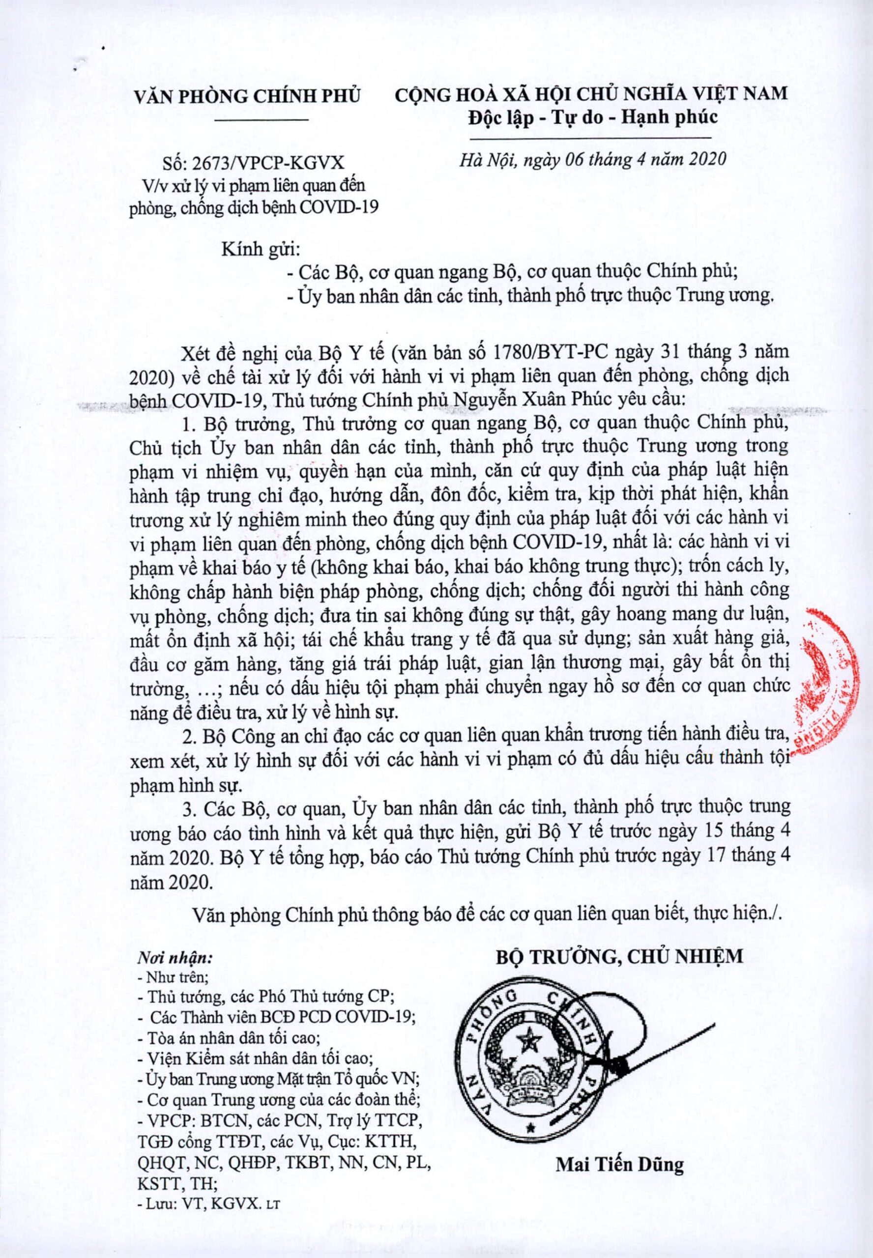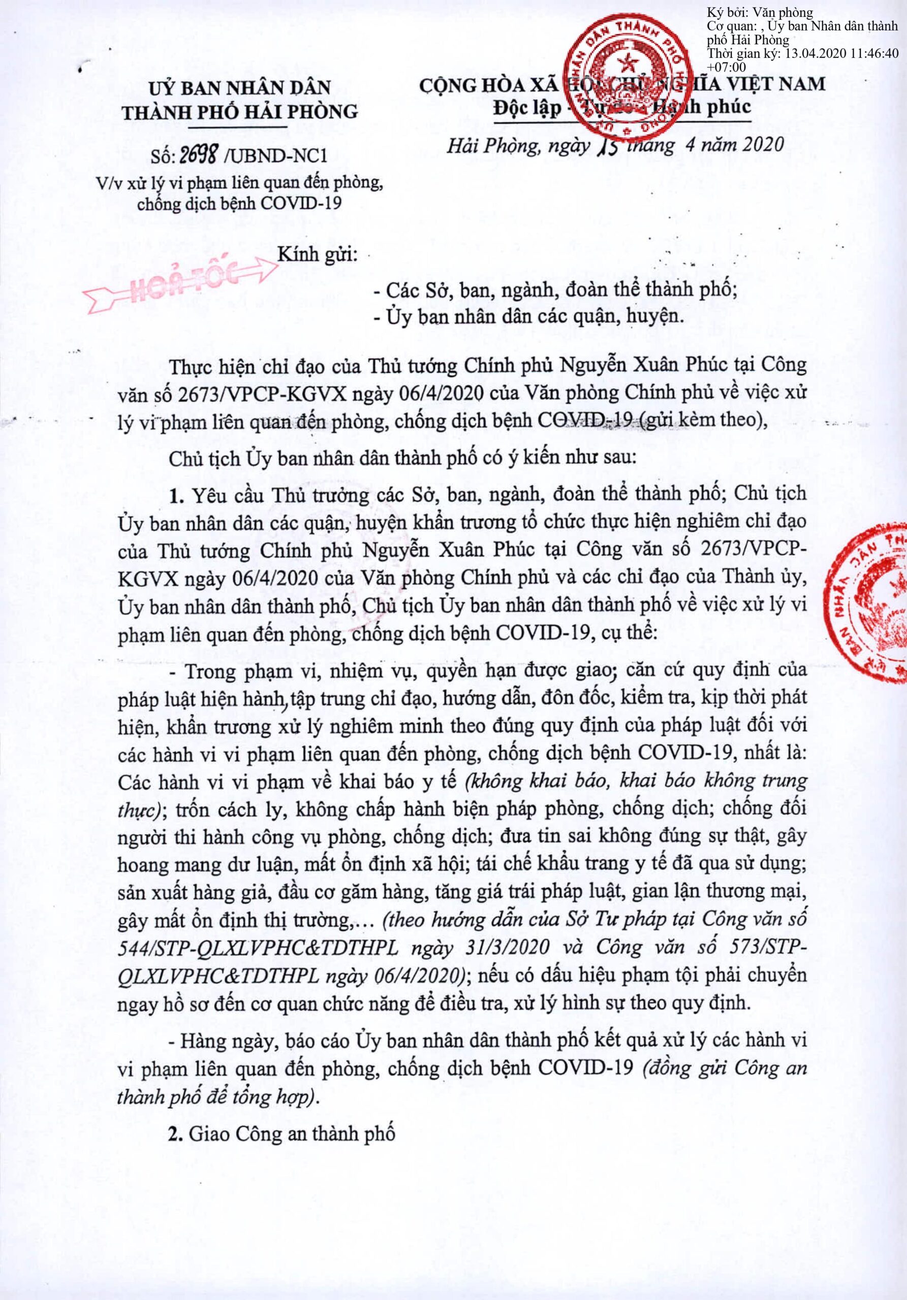 Ủy ban nhân dân thành phố vừa ban hành Công văn số 2698/UBND-NC1 ngày 13/4/2020 về việc xử lý vi phạm liên quan đến phòng, chống dịch bệnh Covid-19.