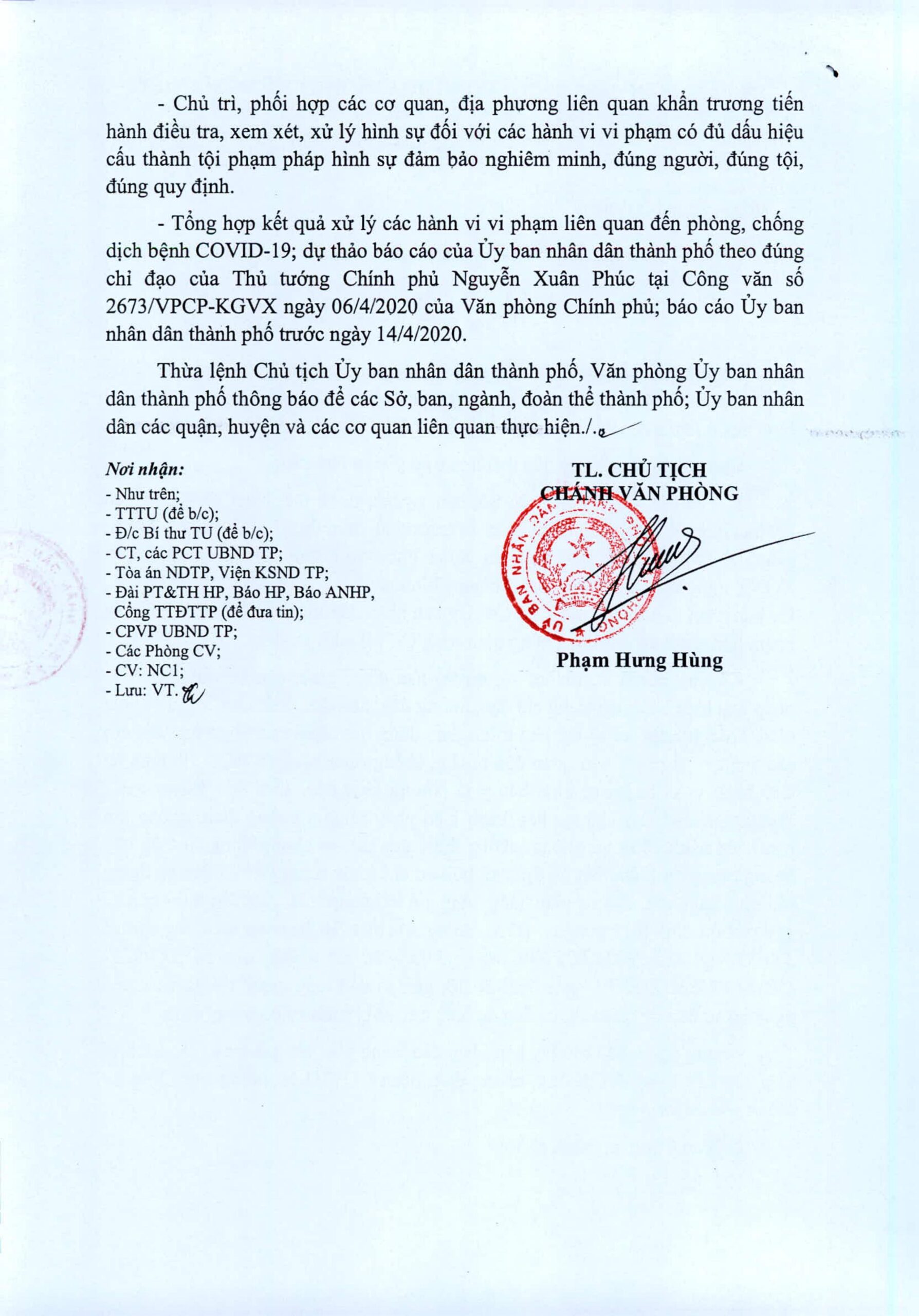 Theo đó, yêu cầu Thủ trưởng các Sở, ban, ngành, đoàn thể thành phố; Chủ tịch Ủy ban nhân dân các quận, huyện trong phạm vi, nhiệm vụ, quyền hạn được giao, căn cứ quy định của pháp luật hiện hành, tập trung chỉ đạo, hướng dẫn, đôn đốc, kiểm tra, kịp thời phát hiện, khẩn trương xử lý nghiêm minh theo đúng quy định của pháp luật đối với các hành vi vi phạm liên quan đến phòng, chống dịch bệnh Covid-19, nhất là: các hành vi vi phạm về khai báo y tế (không khai báo, khai báo không trung thực); trốn cách ly, không chấp hành biện pháp phòng, chống dịch; chống đối người thi hành công vụ phòng, chống dịch; đưa tin sai không đúng sự thật, gây hoang mang dư luận, mất ổn định xã hội; tái chế khẩu trang y tế đã qua sử dụng; sản xuất hàng giả, đầu cơ găm hàng, tăng giá trái pháp luật, gian lận thương mại, gây mất ổn định thị trường…; nếu có dấu hiệu phạm tội phải chuyển ngay hồ sơ đến cơ quan chức năng để điều tra, xử lý hình sự theo quy định.