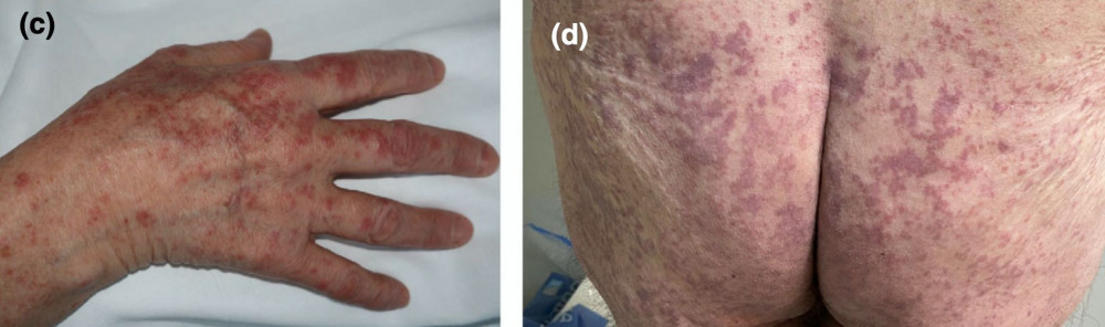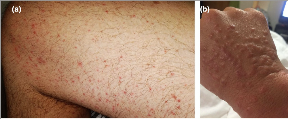 Một số ca có sẩn thâm nhiễm ở mu tay, mu chân, có thể giống hình ảnh giả mụn nước, hồng ban nổi cao dai dẳng hoặc hồng ban đa dạng.