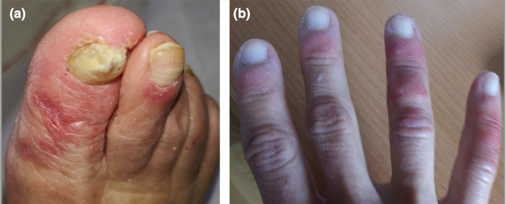 Biểu hiện đỏ da, phù nề ở đầu ngón tay, ngón chân xuất hiện cùng với vài mụn nước hoặc mụn mủ. Tỷ lệ gặp khoảng 19%. Các tổn thương thường không đối xứng.