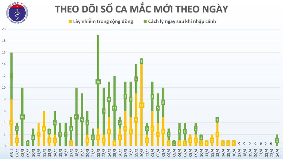 – Tính từ 6h00 đến 18h00 ngày 24/4/2020: 0 ca mắc mới trong cộng đồng.