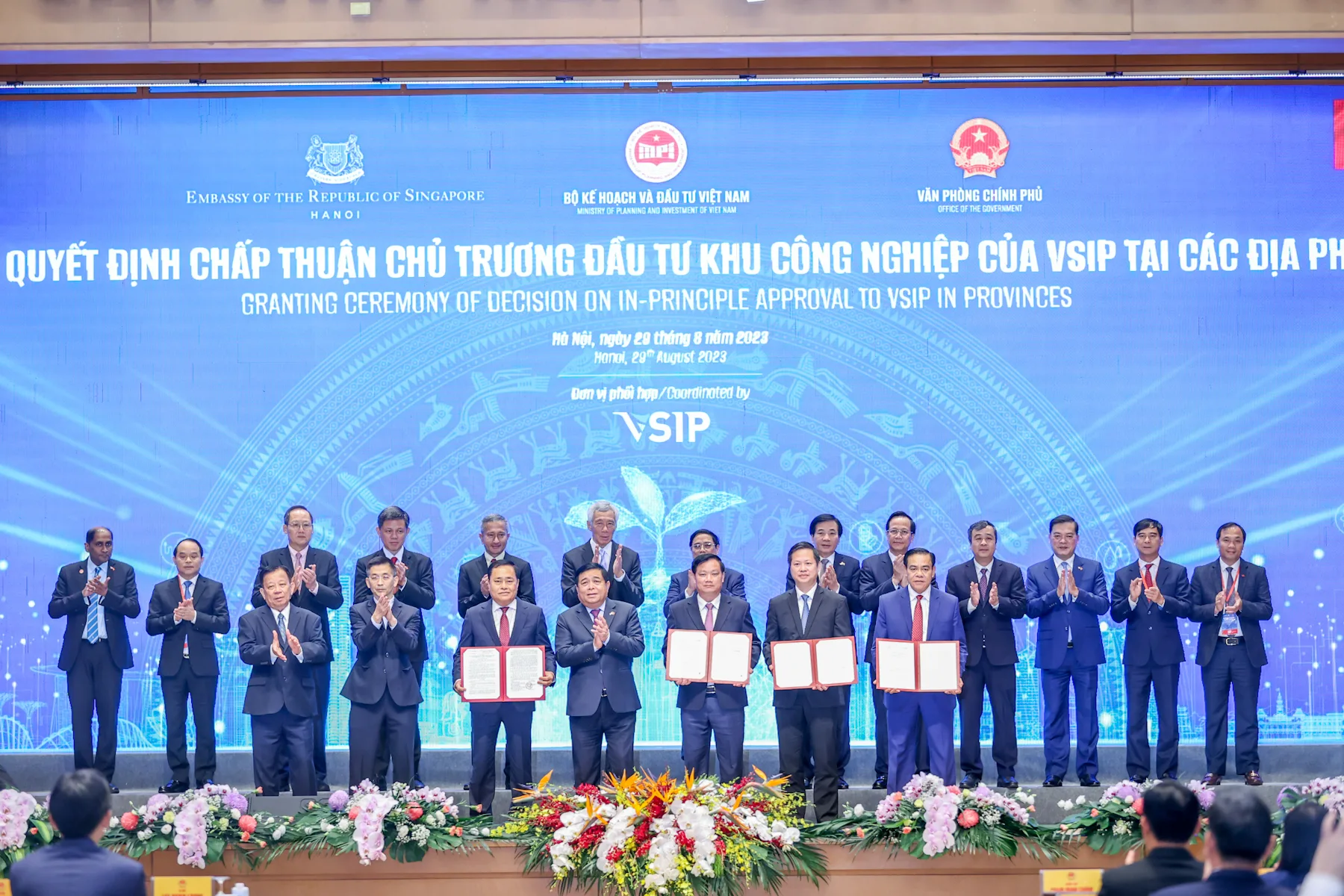 3 dự án khu công nghiệp Việt Nam-Singapore (VSIP) mới được khởi công, 2 dự án VSIP được trao quyết định chấp thuận chủ trương đầu tư, cùng 12 dự án VSIP mới được ký biên bản hợp tác phát triển, tại sự kiện sáng 29/8 với sự có mặt của Thủ tướng Phạm Minh Chính và Thủ tướng Singapore Lý Hiển Long.