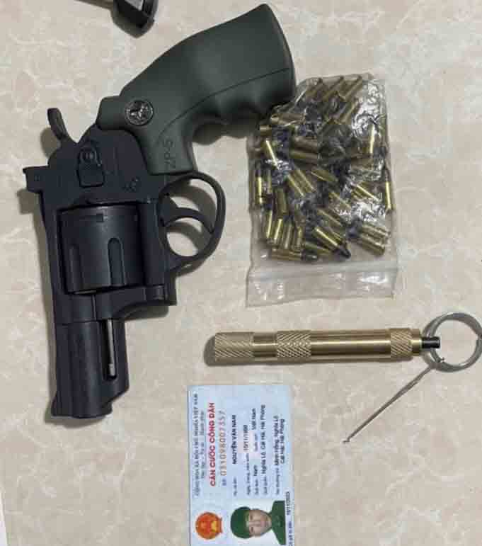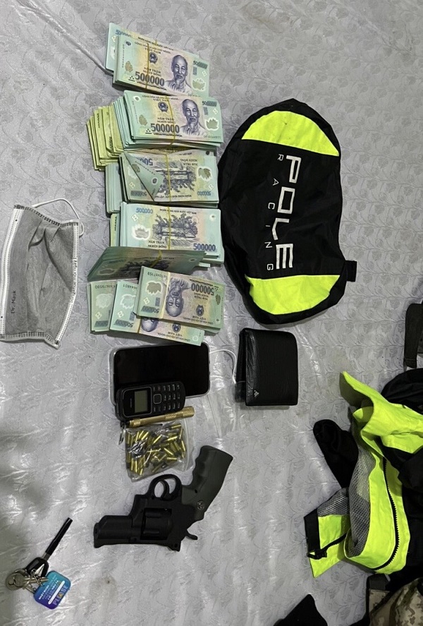 Quá trình truy bắt đối tượng, lực lượng phá án đã thu giữ 800 triệu đồng, 1 xe máy Kawasaki 1.000cc màu xanh đen, 1 súng ngắn ổ quay (trong ổ quay có 6 viên đạn), 1 súng bút dạng rút, 34 viên đạn, 1 balô màu be sữa, 2 ĐTDĐ. Ngay trong đêm, Nam khai nhận: