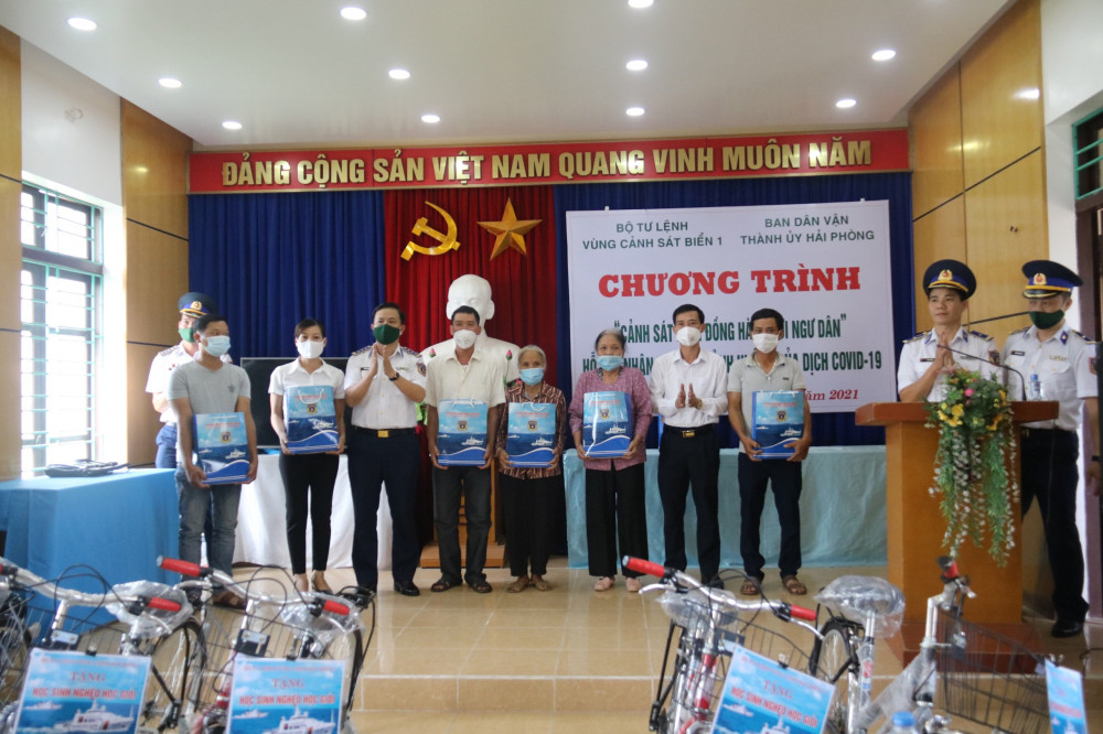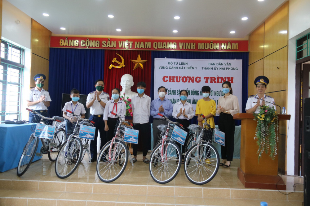 Thực hiện Chương trình phối hợp “Cảnh sát biển đồng hành với ngư dân, Hỗ trợ nhân dân chịu ảnh hưởng của đại dịch COVID-19”, ngày 30/7, Bộ Tư lệnh Vùng Cảnh sát biển 1 phối hợp với Ban Dân vận Thành ủy tổ chức buổi tặng quà 7 Mẹ Việt Nam anh hùng, 50 gia đình chính sách; tặng xe đạp cho 20 cháu học sinh có hoàn cảnh khó vươn lên trong học tập trên địa bàn huyện Vĩnh Bảo.