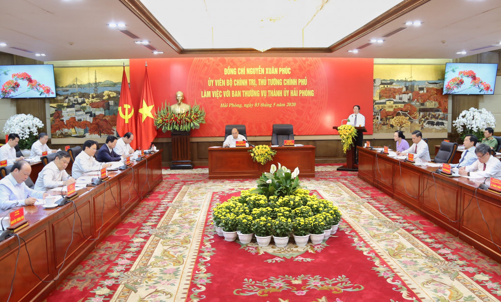 Trong khuôn khổ chuyến thăm, làm việc và tham dự một số sự kiện khởi công, khánh thành các dự án trọng điểm của thành phố Hải Phòng, chiều 3/5, đồng chí Nguyễn Xuân Phúc, Ủy viên Bộ Chính trị, Thủ tướng Chính phủ làm việc với Ban Thường vụ Thành ủy Hải Phòng về tình hình thực hiện nhiệm vụ phát triển kinh tế xã hội 4 tháng đầu năm; việc triển khai các nhiệm vụ, giải pháp trọng tâm nhằm khắc phục ảnh hưởng của dịch COVID-19 và thúc đẩy sản xuất, kinh doanh bảo đảm hoàn thành các chỉ tiêu kinh tế – xã hội năm 2020.