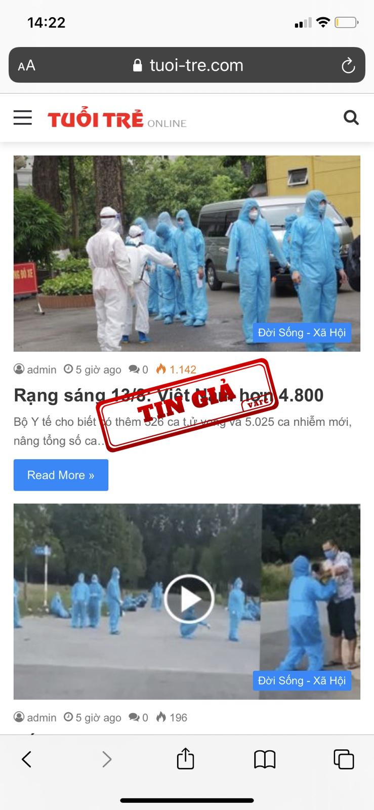 Qua công tác rà soát và tiếp nhận thông tin, Trung tâm Xử lý tin giả Việt Nam (VAFC) xác định website tại địa chỉ: https://tuoi-tre.com/ có tên miền gây nhầm lẫn với cơ quan báo chí, giả mạo Báo Tuổi trẻ Online, đăng thông tin sai sự thật về dịch bệnh covid-19, hoạt động cung cấp thông tin tổng hợp trên mạng internet khi chưa được cơ quan có thẩm quyền cấp giấy phép.