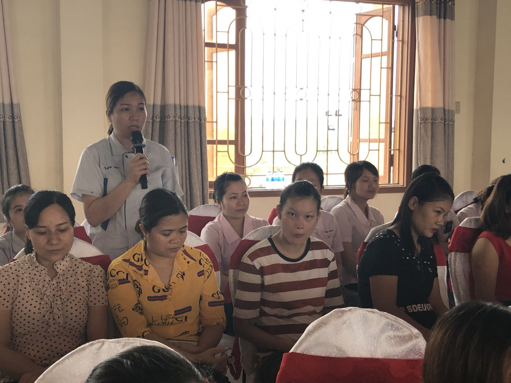 Trạm trưởng Trạm y tế xã trả lời công nhân về việc tiêm phòng cho trẻ em
