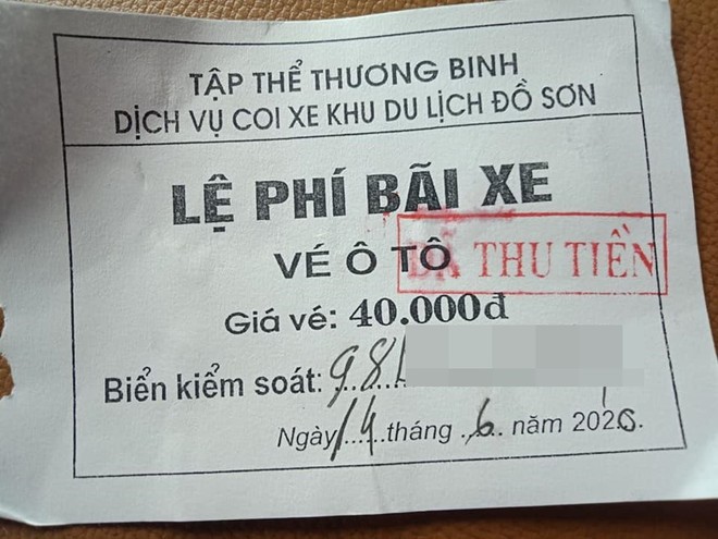Sau khi đóng tiền, anh Đ.P.H nhận lại 1 vé có ghi “tập thể thương binh – dịch vụ coi xe khu du lịch Đồ Sơn – lệ phí bãi xe – vè ô tô: 40.000 đồng”. Vé xe không có dấu của cơ quan chức năng nào ở Hải Phòng.