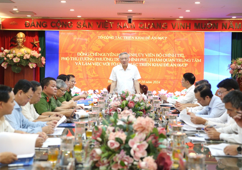 Phát biểu tại buổi việc, Phó Thủ tướng Thường trực Nguyễn Hòa Bình bày tỏ ấn tượng trước những kết quả của Tổ Công tác triển khai Đề án 06 của Chính phủ đã đạt được trong gần 3 năm triển khai; hoan nghênh lãnh đạo các bộ, ngành, thành viên Tổ Công tác, đặc biệt là Bộ Công an với những kết quả hết sức ấn tượng, góp phần tạo sự chuyển biến mạnh mẽ trong chuyển đổi số.