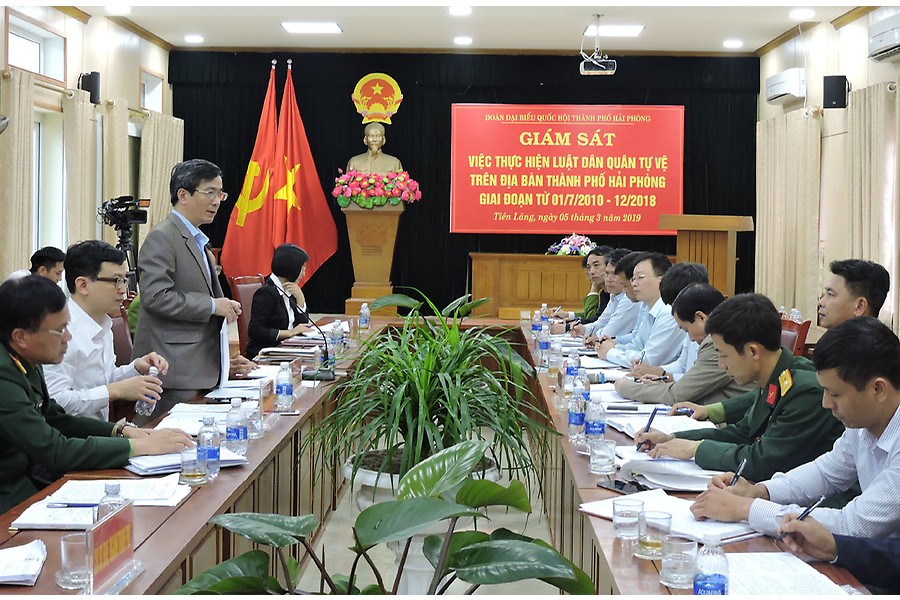 * Chiều 5-3, Đoàn đại biểu Quốc hội Hải Phòng giám sát việc thực hiện Luật Dân quân tự vệ tại quận Hồng Bàng.