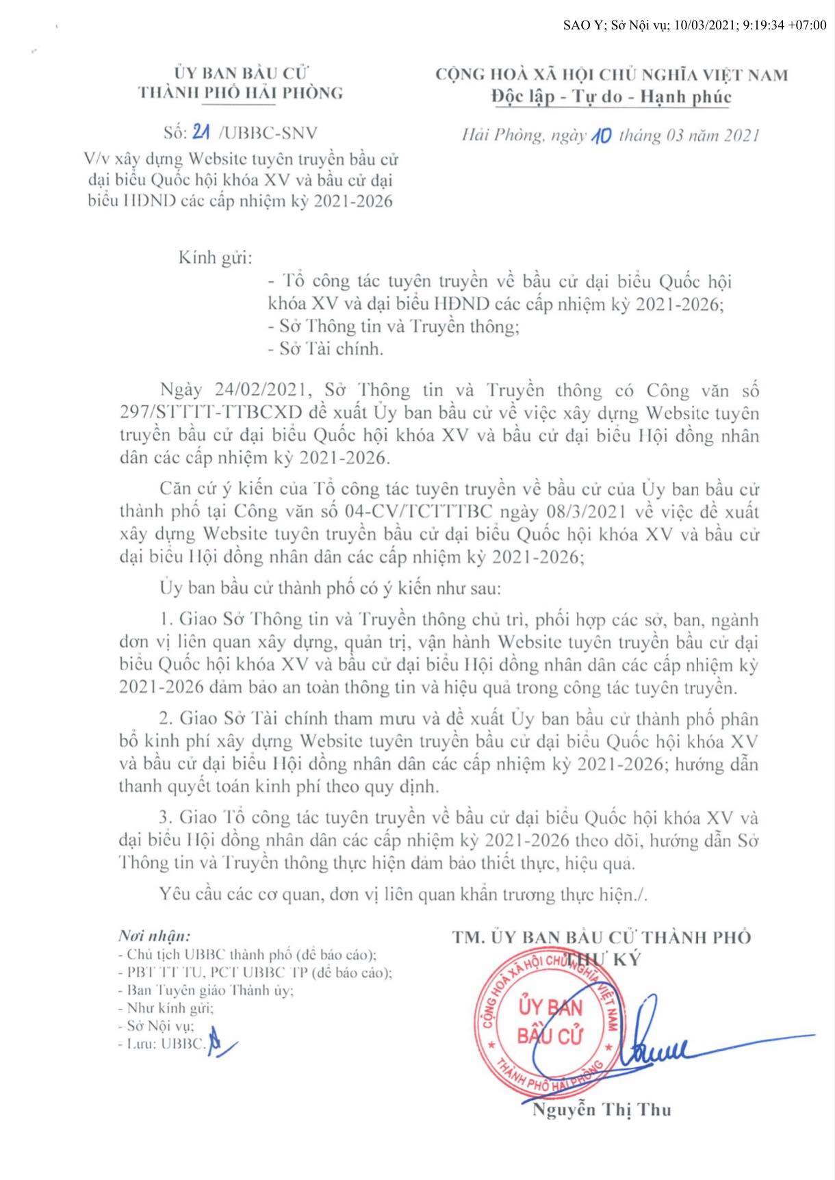 Ủy ban bầu cử thành phố vừa ban hành Công văn số 21/UBBC-SNV ngày 10/3/2021 về việc xây dựng Website tuyên truyền bầu cử đại biểu Quốc hội khóa XV và bầu cử đại biểu HĐND các cấp nhiệm kỳ 2021-2026. Theo đó: