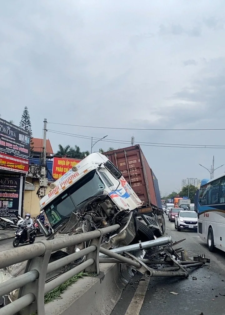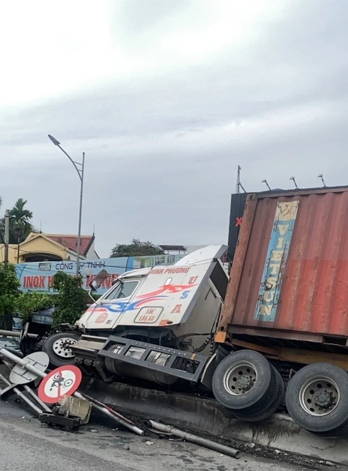 Một vụ tai nạn xe container đâm vào lan can cầu vượt Nguyễn Văn Linh, thuộc địa bàn quận Lê Chân, Hải Phòng rất may không có thương vong về người.