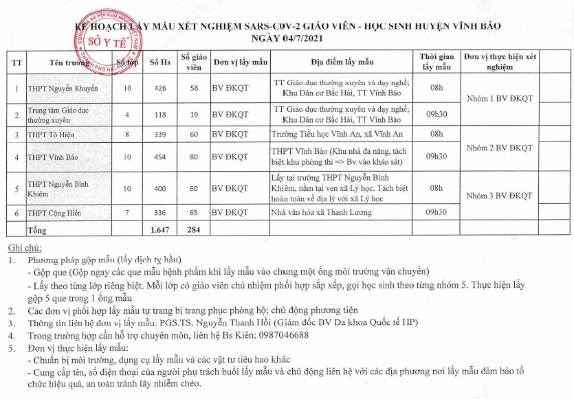 Đơn vị thực hiện lấy mẫu và xét nghiệm COVID-19 là Bệnh viện Đa khoa Quốc tế Hải Phòng, sẽ chia làm 3 nhóm lấy mẫu và ưu tiên trả kết quả sớm nhất có thể cho các đối tượng nêu trên về Sở Giáo dục và Đào tạo.