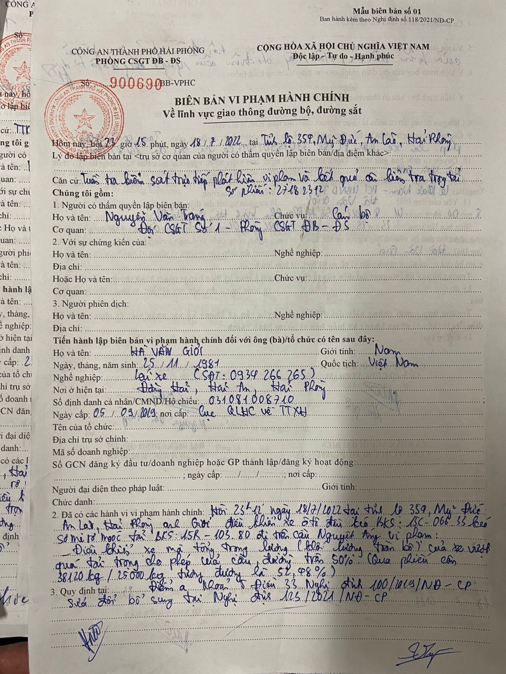 Cụ thể, vào 23h15 ngày 18/7, trên tỉnh lộ 354, đoạn qua xã Mỹ Đức, huyện An Lão, tổ công tác kiểm tra xe ô tô đầu kéo BKS: 15C-066.33 kéo sơ-mi rơ-moóc BKS: 15R-103.80 do Hà Văn Giỏi, sinh 1981, trú tại phường Đằng Hải, quận Hải An, điều khiển đi trên cầu Nguyệt Áng, đã vi phạm: điều khiển xe mà tổng trọng lượng (khối lượng toàn bộ) của xe vượt quá tải trọng cho phép của cầu đường trên 50% (Qua phiếu cân 38.120kg/25.000kg, tương đương 52,48%), đã vi phạm điểm a khoản 5 Điều 33 Nghị định 100/2019/NĐ-CP sửa đổi bổ sung tại Nghị định 123/2021/NĐ-CP.