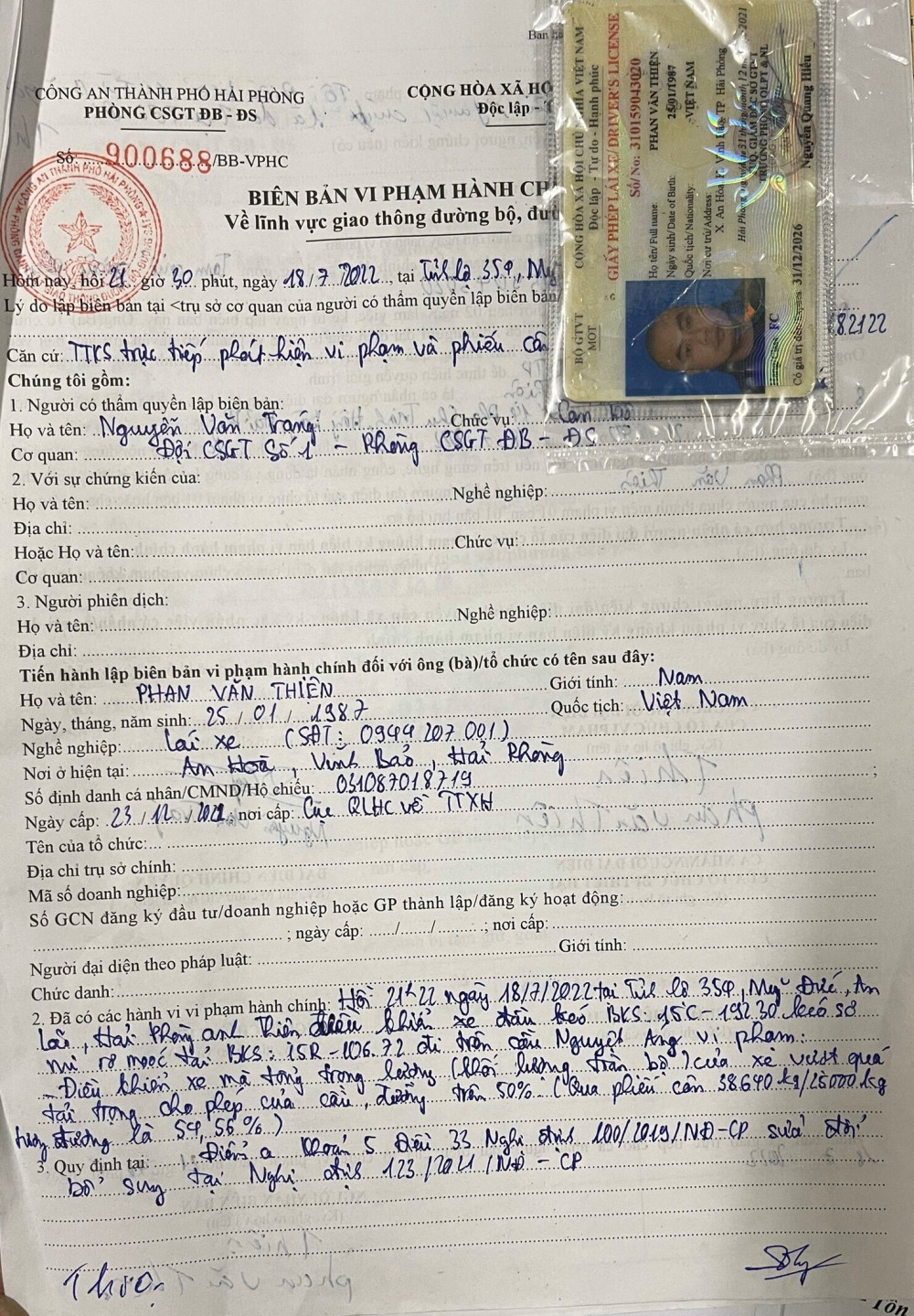 Trước đó, vào 21h22 cùng ngày 18/7, trên tỉnh lộ 354, đoạn qua xã Mỹ Đức, huyện An Lão, tổ công tác cơ động Phòng CSGT đường bộ-đường sắt cũng trực tiếp phát hiện, kiểm tra, lập biên bản xử lý Phạm Văn Thiện, sinh 1987, trú tại An Hòa, Vĩnh Bảo, điều khiển xe ô tô mang BKS: 15C-192.30 kéo sơ-mi rơ-moóc BKS: 15R-106.72 đi trên cầu Nguyệt Áng, vi phạm: điều khiển xe mà tổng trọng lượng (khối lượng toàn bộ) của xe vượt quá tải trọng cho phép của cầu đường trên 50% (qua phiếu cân 38.640kg/25.000kg, tương đương 54,56%), đã vi phạm điểm a khoản 5 Điều 33 Nghị định 100/2019/NĐ-CP, sửa đổi bổ sung tại Nghị định 123/2021/NĐ-CP.