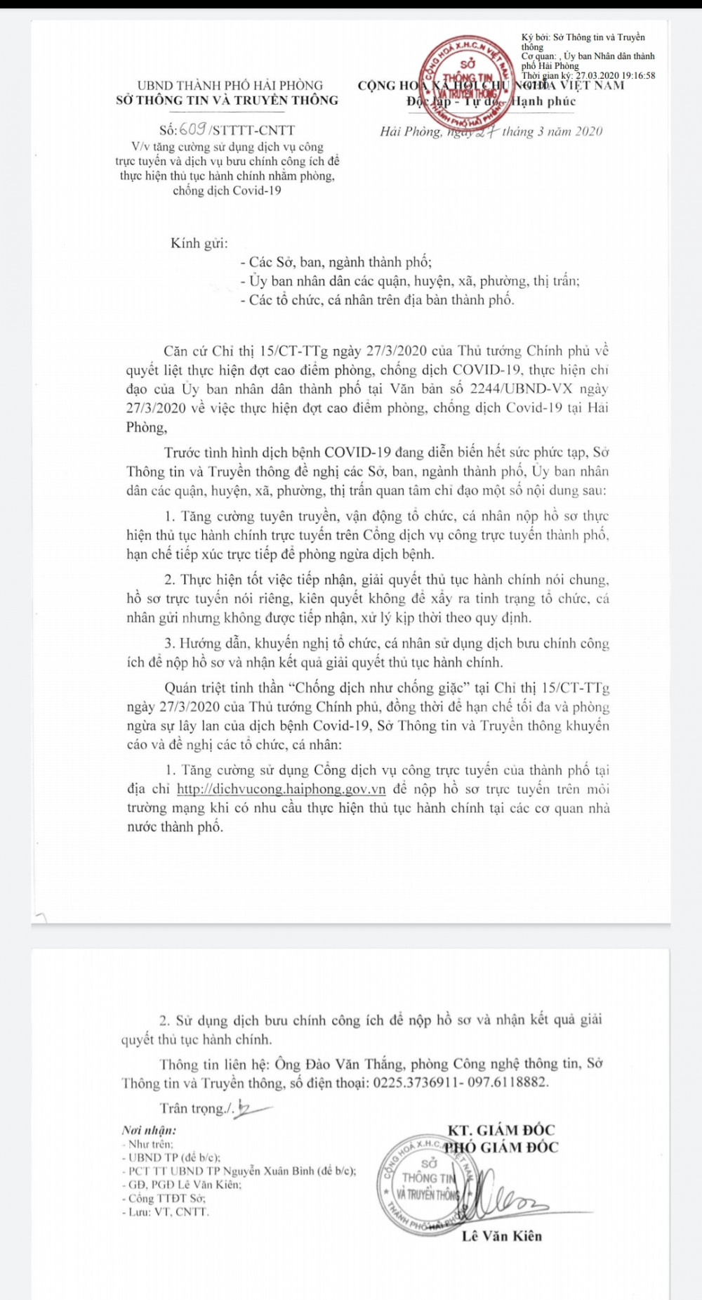Sở Thông tin Truyền thông vừa có Văn bản số 609/STTTT-CNTT về việc tăng cường sử dụng dịch vụ công trực tuyến và dịch vụ bưu chính công ích để thực hiện thủ tục hành chính nhằm phòng chống dịch Covid-19. Nội dung cụ thể như sau: