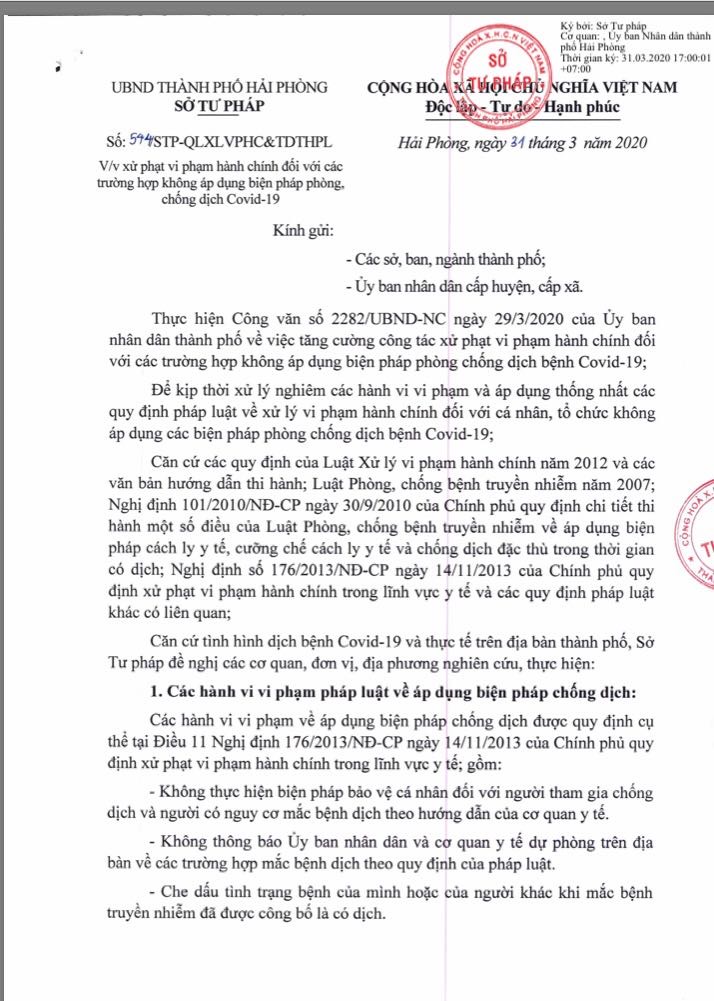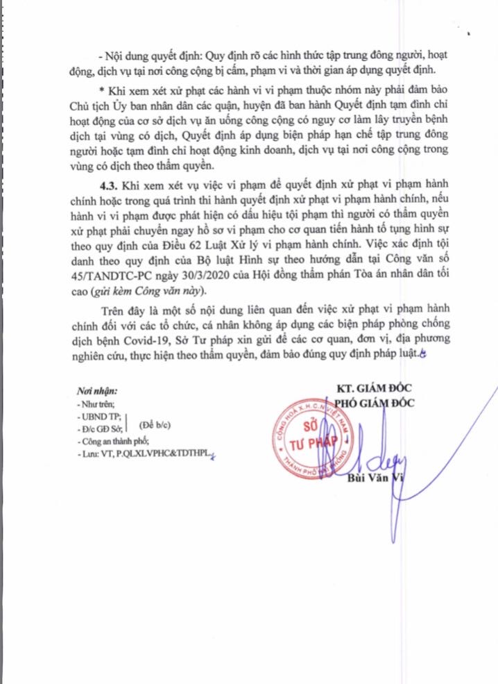 Để kịp thời xử lý nghiêm các hành vi vi phạm và áp dụng thống nhất các quy định pháp luật về xử lý vi phạm hành chính đối với các cá nhân, tổ chức không áp dụng biện pháp phòng chống dịch bệnh Covid-19, Sở Tư pháp đã ban hành văn bản số 54/STP-XLVPHC&TDTHPL về việc xử lý vi phạm hành chính đối với các cá nhân, tổ chức không áp dụng biện pháp phòng chống dịch bệnh Covid-19