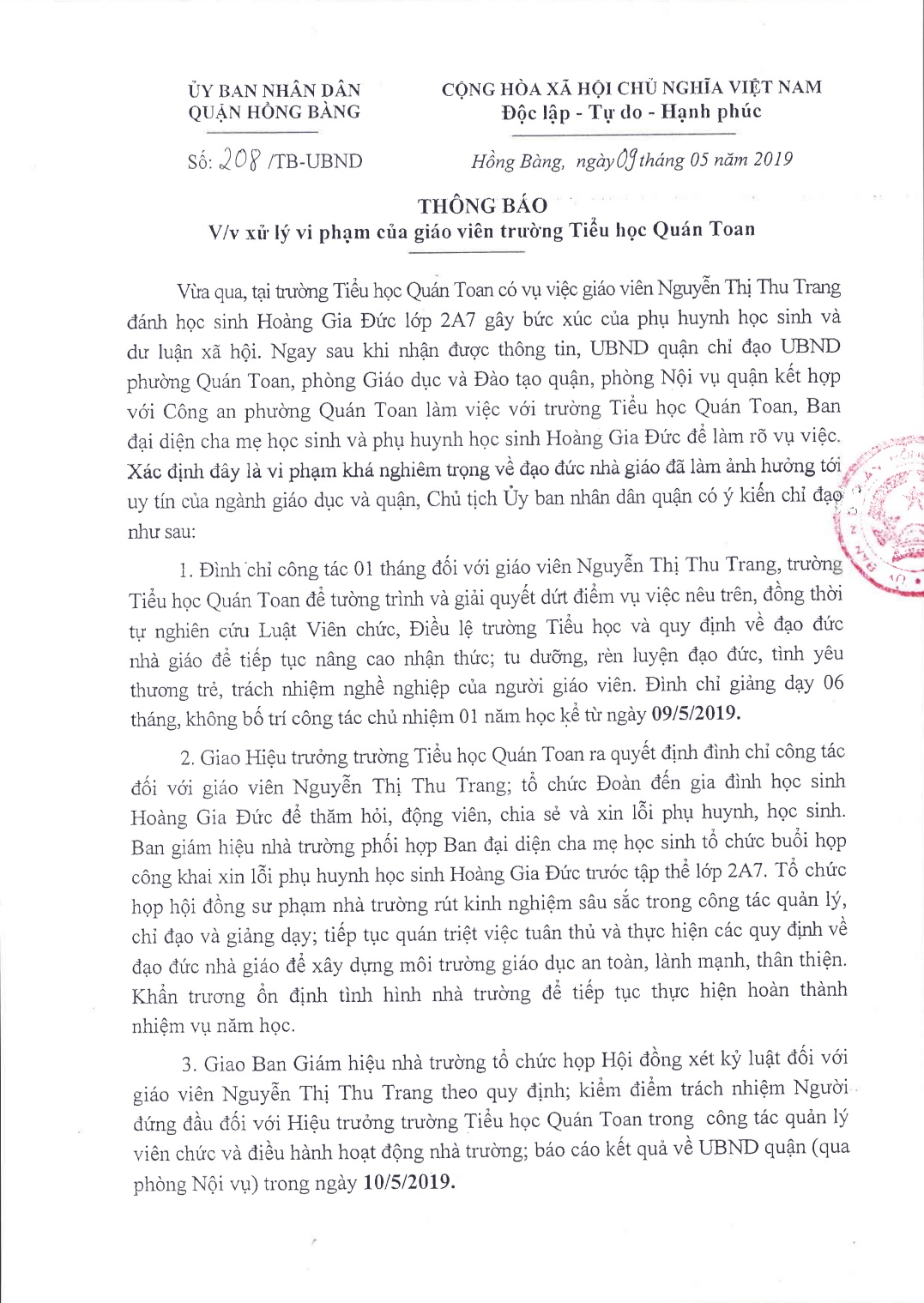 Ngày 9/5/2019, Ủy ban nhân dân quận Hồng Bàng có Thông báo số 208/TB-UBND về việc xử lý vi phạm của giáo viên Trường Tiểu học Quán Toan, theo đó Chủ tịch UBND quận Hồng Bàng có chỉ đạo rõ, đình chỉ công tác giảng dạy 6 tháng và không bố trí làm chủ nhiệm trong 1 năm đối với cô giáo trường Tiểu học Quán Toan đã có hành vi đánh học sinh.