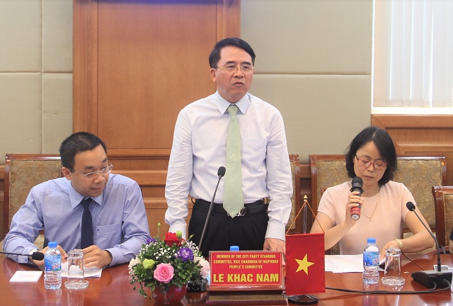 Phó Chủ tịch UBND thành phố Lê Khắc Nam chào mừng Đoàn công tác của thành phố Lệ Giang đến thăm và làm việc tại Hải Phòng. Đồng chí thông tin một số nét về tình hình kinh tế – xã hội, quốc phòng – an ninh thành phố; giới thiệu quy mô, tiềm năng của du lịch Hải Phòng đến đoàn công tác thành phố Lệ Giang nhằm giúp phía bạn tìm hiểu, phát triển, kết nối mở đường bay Hải Phòng – Lệ Giang.